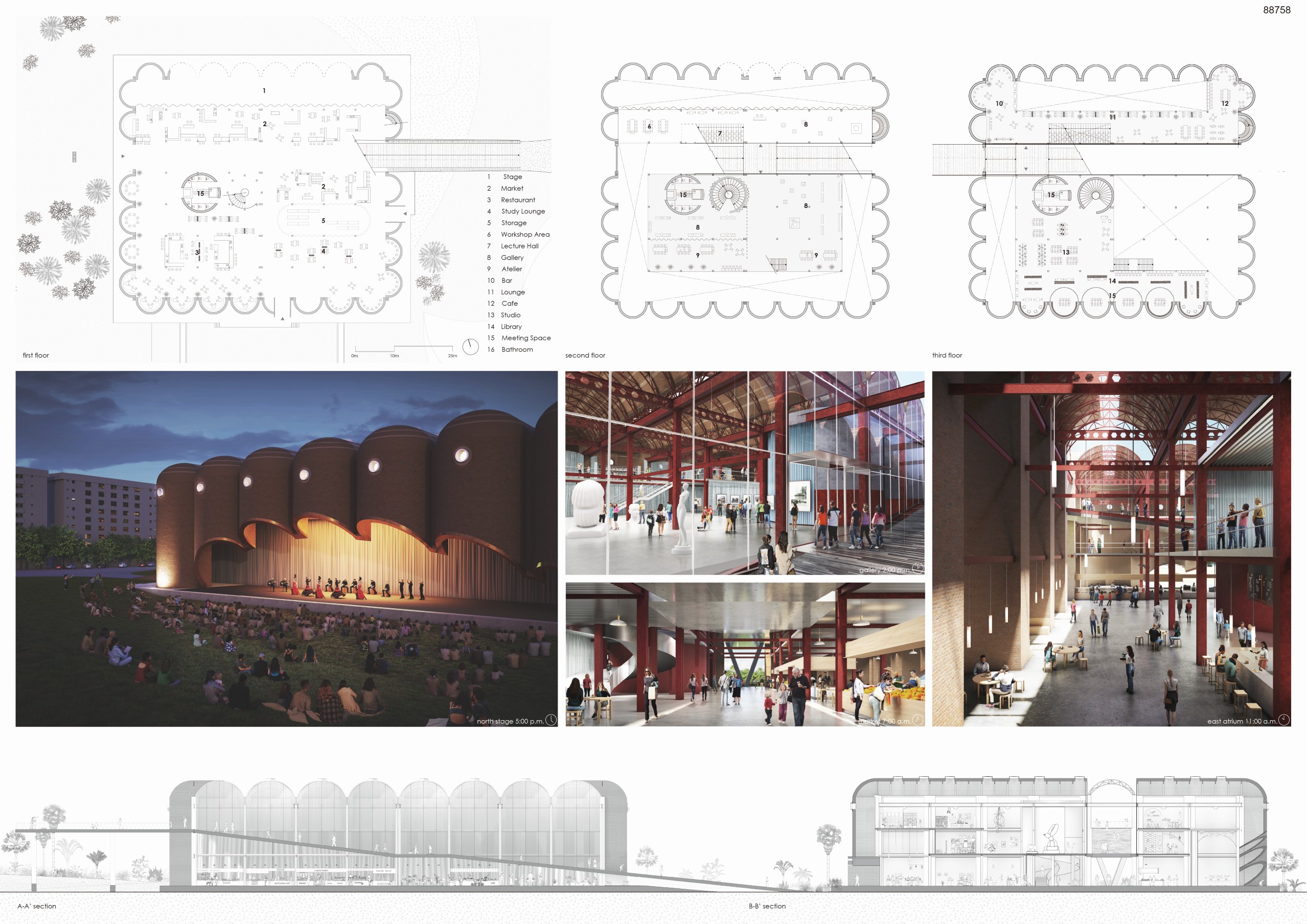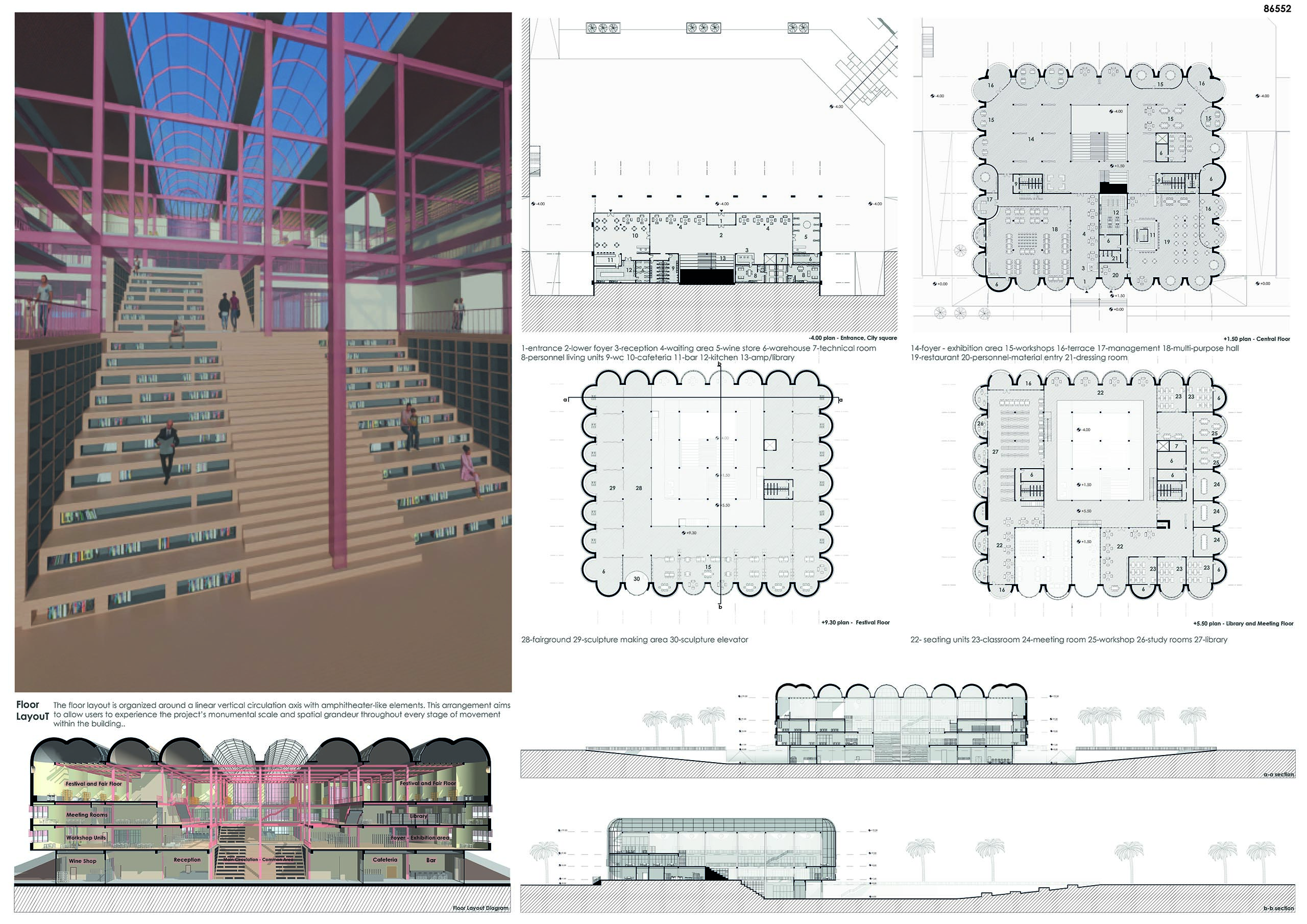 On the uppermost level, a flexible festival and exhibition floor defined by movable partitionpanels is proposed. This floor adapts to various programs throughout the year, reinforcing thebuilding’s dynamic and civic character. Additionally, a sculpture elevator system is introduced to facilitate the transport of large-scale artworks and equipment. This systemenables efficient movement of materials required for festivals, fairs, and events, allowing thefestival floor to seamlessly connect with the rear entrance and adjust to diverse spatial needs.
