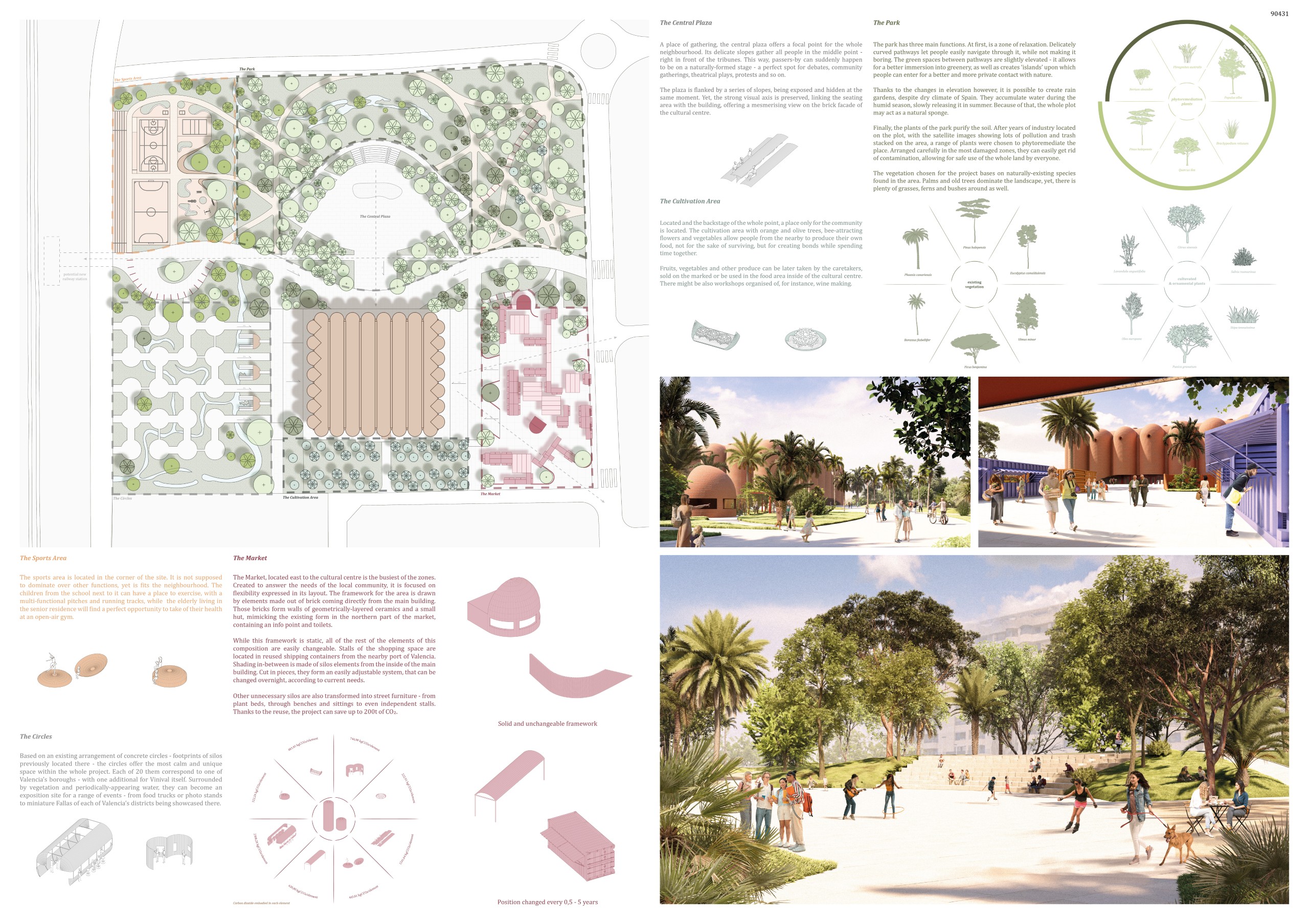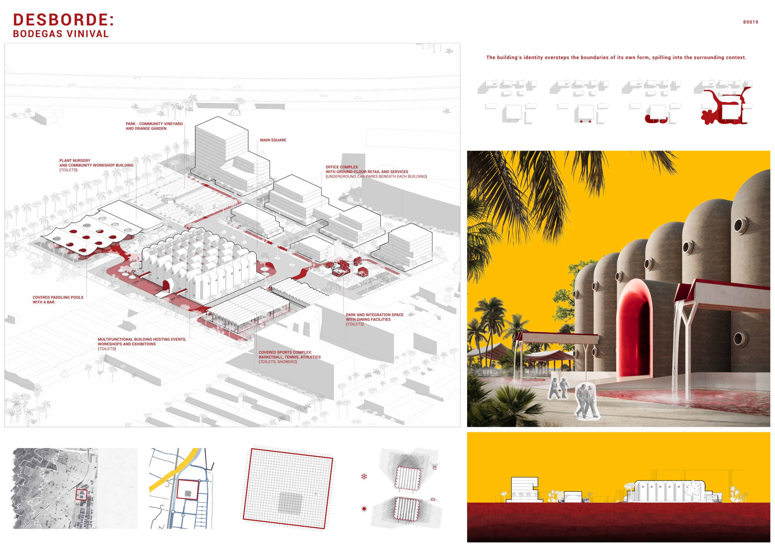 The design, heavily inspired by the internal layout of Bodegas Vinival, creates surprising spaces by offering diverse spatial experiences at different elevations and reflecting a dynamic, playful social loop. Considering Vinival’s climate, the design incorporates extensive shaded areas, green spaces, and semi-open and closed structures, ensuring a lively, colorful, and unique environment that integrates with the urban fabric and appeals to all ages.