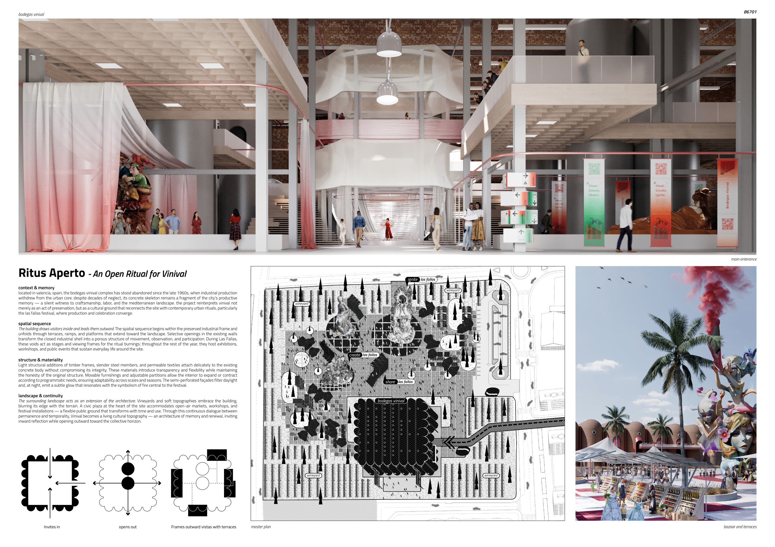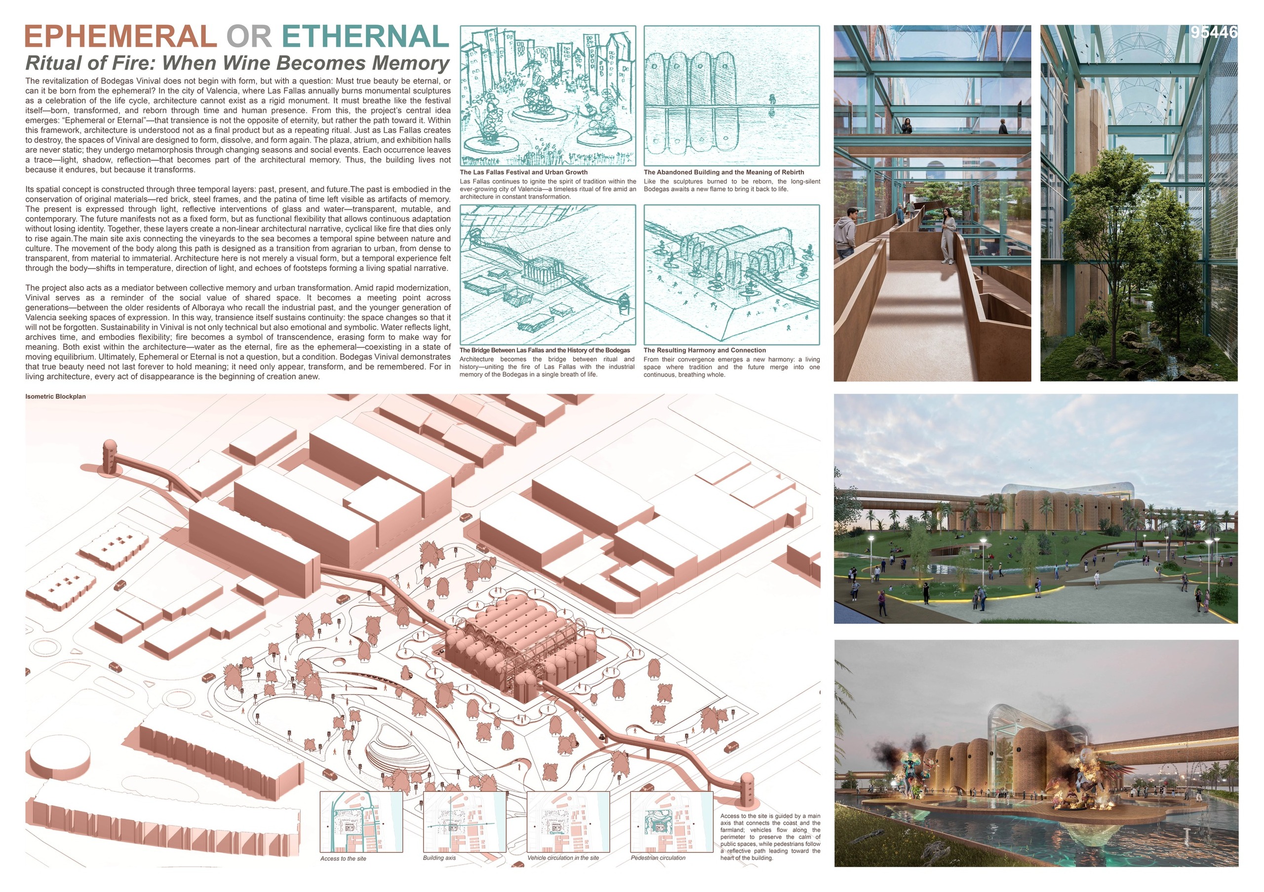 Three conceptual anchors guide the design: Las Fallas as cultural transformation, the butterfly as biological metaphor of metamorphosis, and the bridge as spatial and social connector. Together, they form a living architectural system. In this way, Bodegas Vinival is not merely restored but reborn—an architecture that breathes through light, time, and human presence: a space made eternal by its constant transformation.