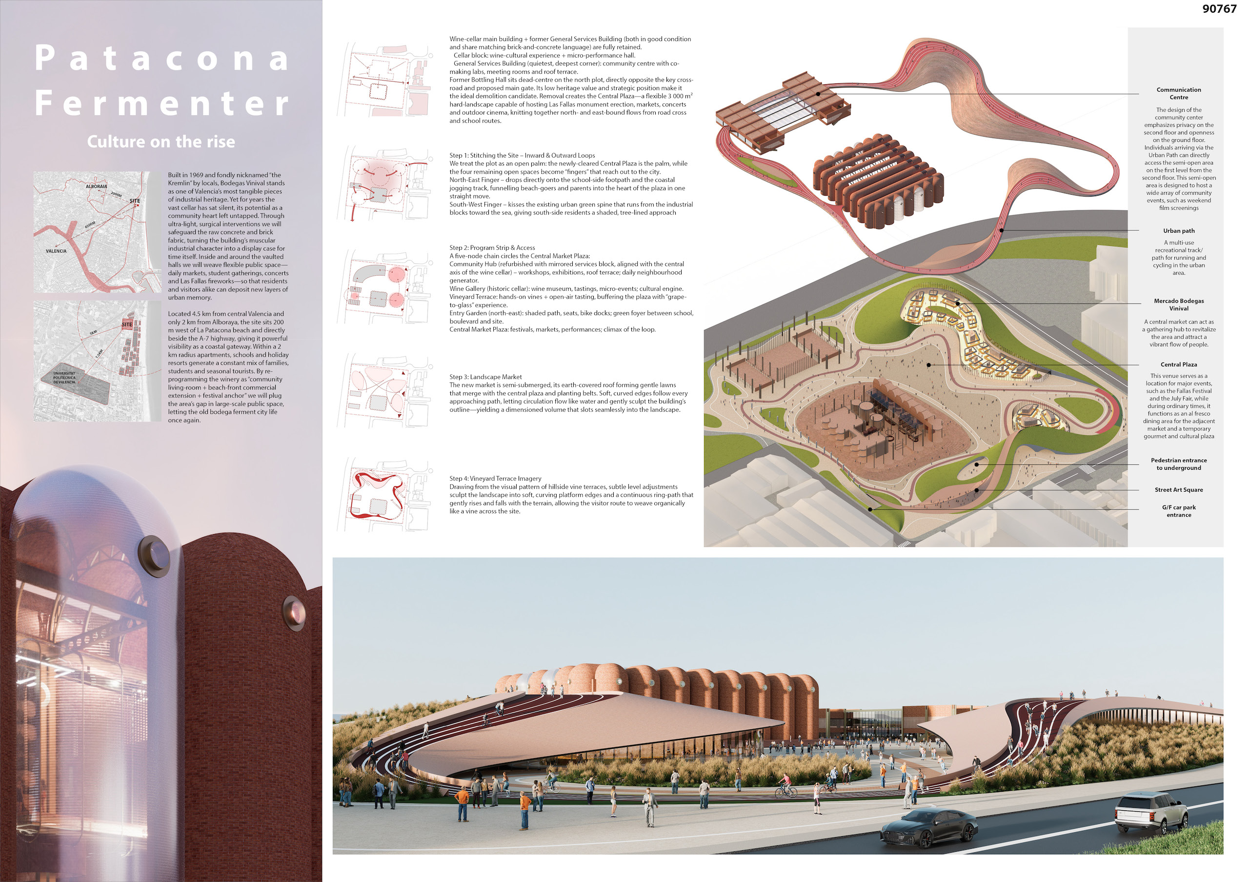 The landmark main cellar is retained, while later, damaged annexes are removed, allowing the pure volume and raw brick texture to remain the protagonist. New programmes slip invisibly into place: a semi-buried northern block merges a public market with a planted belvedere, gently lifting a slow-loop promenade that frames the port, the sea and the pyrotechnics of Las Fallas. An open ring of circulation and urban greenery wraps the cellar, creating a shaded civic plaza, stepped seating and flexible stalls for food markets; a continuous permeable pavement and planting ribbon stitches the site into the coastal jogging network, turning it into the hub of the district’s slow-mobility system.