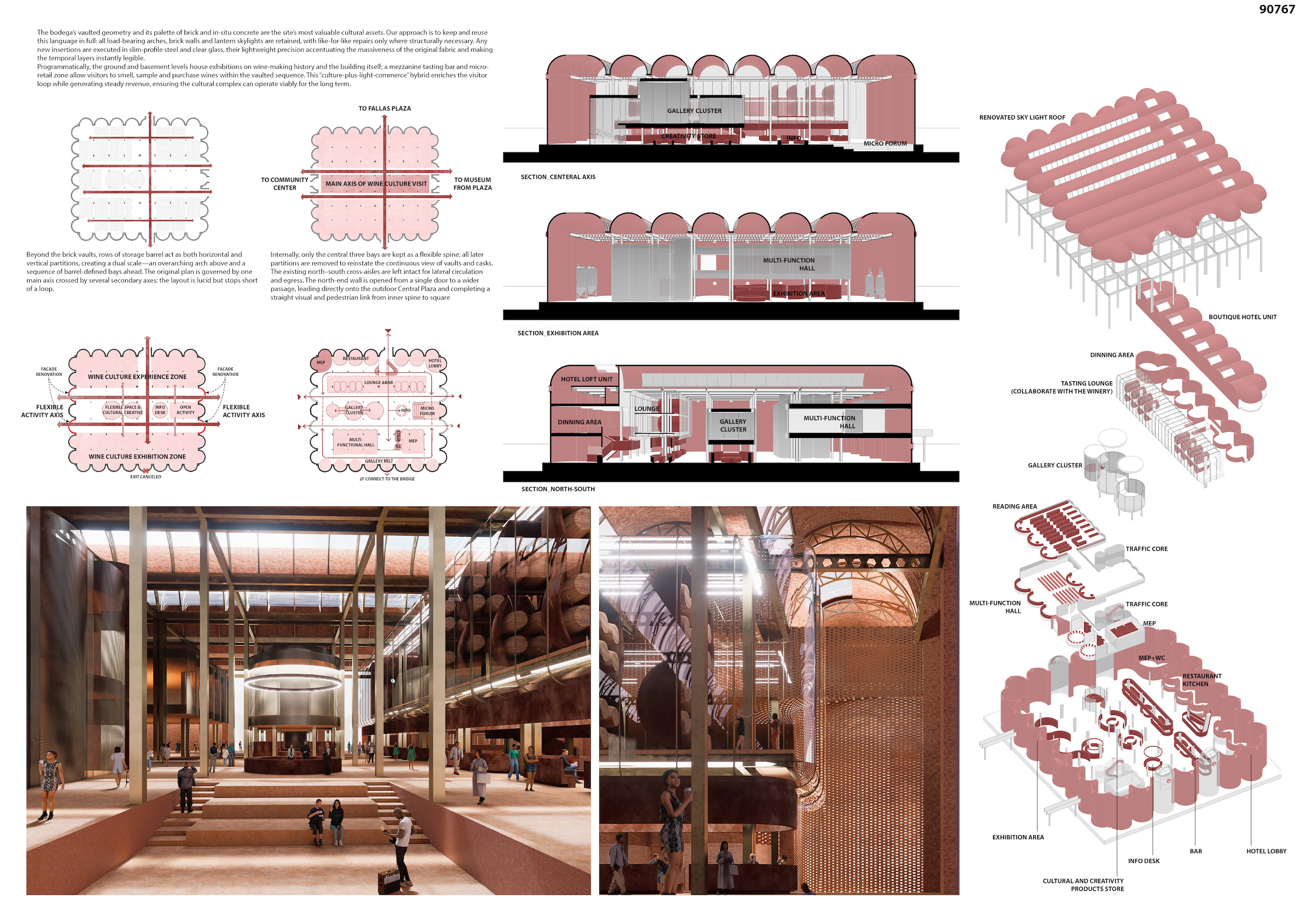 Former wine tanks are also retained and reimagined as fabrication modules and vertical cores. Their dense, cylindrical forms accommodate elevators, workshops, and storage, offering a new kind of architectural gravity anchored in material memory. This is not simple reuse, but an act of recomposition— where the traces of the past support evolving future possibilities.