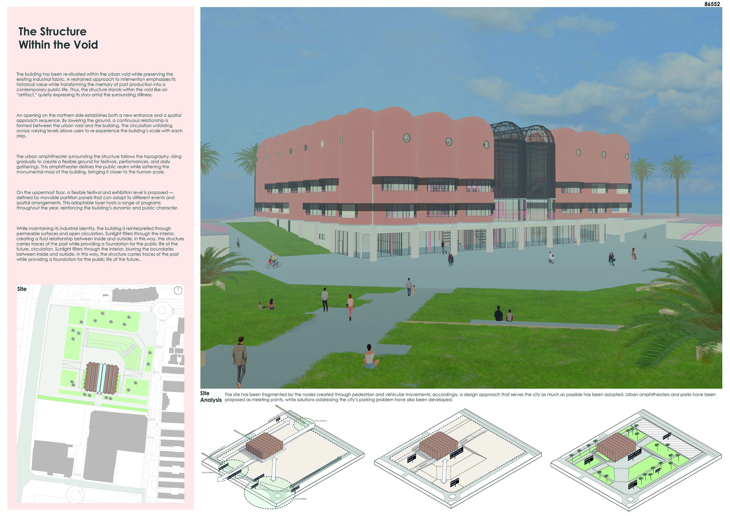 In our proposal, The Structure Within the Void, the existing industrial fabric is preserved whilethe urban void is reinterpreted. Our restrained design approach emphasizes the building’shistorical value and transforms the memory of industrial production into a form of contemporary public life. In this way, the structure exists within the void like an “artifact,” quietly expressing its own narrative amid the surrounding stillness.